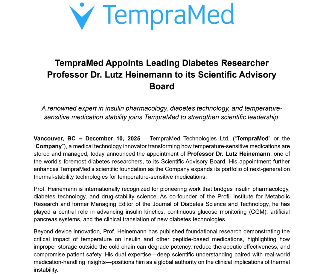 TempraMed Appoints Leading Diabetes Researcher Professor Dr. Lutz Heinemann to its Scientific Advisory Board