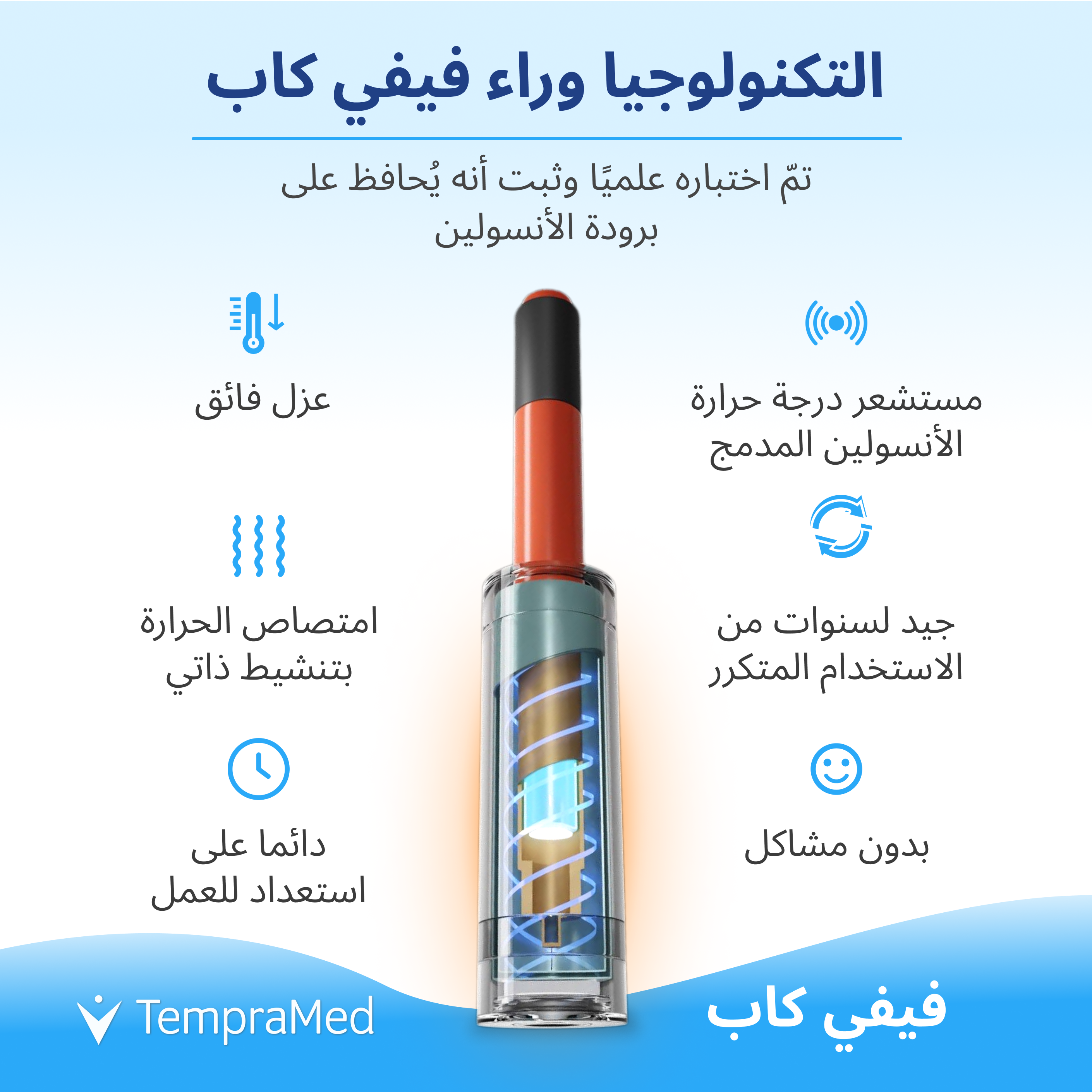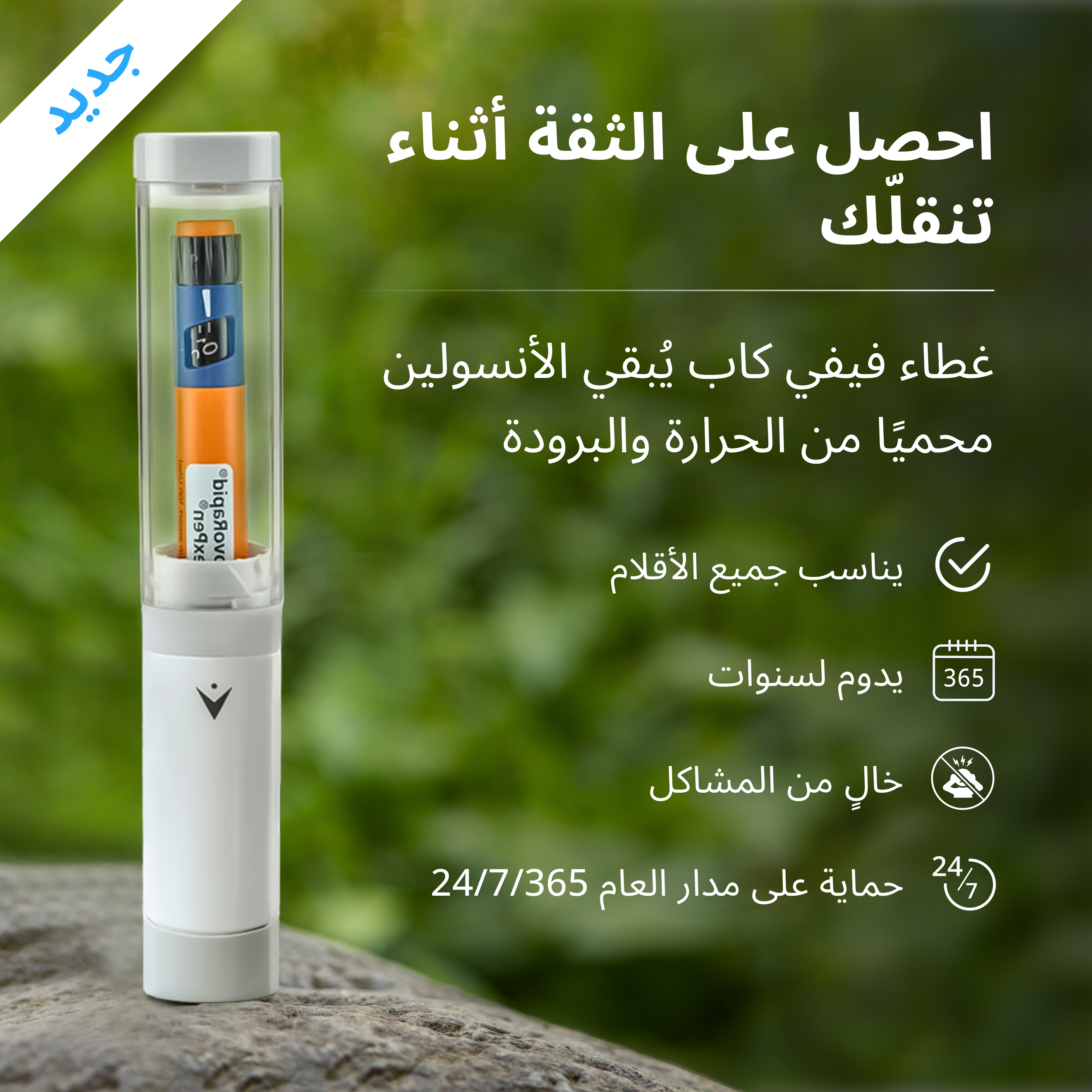 يحفظ الأنسولين في درجة الحرارة المناسبة، حتى في درجات الحرارة الشديدة أو البرودة. ثبت أنه المنتج الأكثر فعالية لحماية قلم الأنسولين من درجة حرارة (منشور في المجلات الأكاديمية). حيث أنه يعمل مع أي قلم أنسولين، ومصمم ليمنحك حريتك مجدداً.